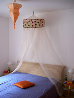 Das Schlafzimmer ist freundlich und mit einem gemütlichen Rattanbett (1,60m x 2,00m), einem großen antiken Kleiderschrank und einem zweiten Fernseher ausgestattet.